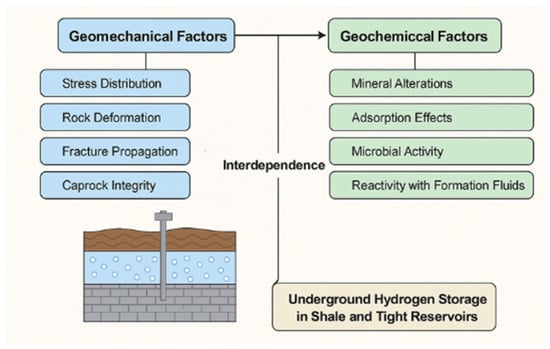 Underground hydrogen storage (UHS) in shale and tight reservoirs offers a promising solution for large-scale energy storage, playing a critical role in the transition to a hydrogen-based economy. However, the successful deployment of UHS in these low-permeability formations depends on a thorough understanding of the geomechanical and geochemical factors that affect storage integrity, injectivity, and long-term stability. This review critically examines the geomechanical aspects, including stress distribution, rock deformation, fracture propagation, and caprock integrity, which govern hydrogen containment under subsurface conditions. Additionally, it explores key geochemical challenges such as hydrogen-induced mineral alterations, adsorption effects, microbial activity, and potential reactivity with formation fluids, to evaluate their impact on storage feasibility. A comprehensive analysis of experimental studies, numerical modeling approaches, and field applications is presented to identify knowledge gaps and future research directions.