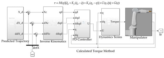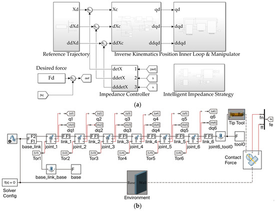 Figure 6. To accurately replicate the dynamic behavior of the manipulator—including realistic contact interactions and control performance—a multi-toolbox co-simulation architecture is employed. Specifically, the virtual testbed is built using the Simscape Multibody physics simulation toolbox, which perfectly integrates the Unified Robot Description Format (URDF) model of the EFORT serial robotic manipulator as a benchmark robot system. The topological structure of this model is illustrated in