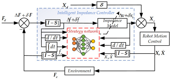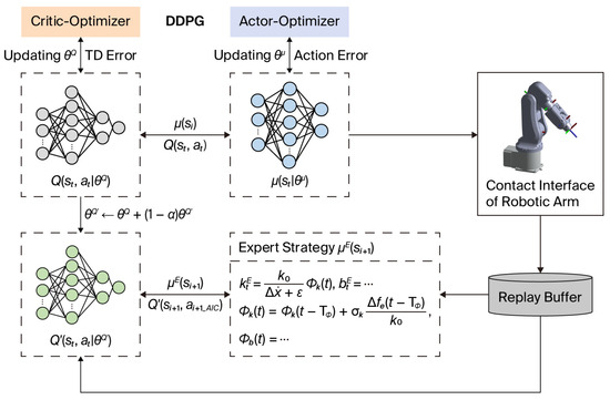 Figure 3. This architecture achieves closed-loop adaptation of impedance parameters through trial-and-error interaction with various unknown environmental dynamics. The core innovation lies in the integration of a DRL policy with an expert-guided strategy network that makes it autonomously tune impedance parameters, thereby enabling robust and sample-efficient force tracking in environments characterized by time-varying and uncertain contact properties.