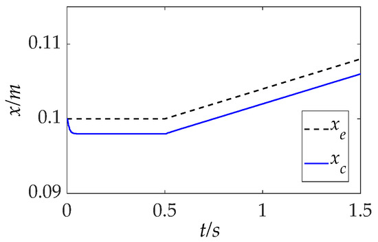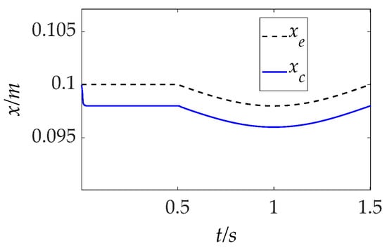 Section 5.2.1, with the reference contact force maintained at a constant value. To quantitatively evaluate the proposed controller’s adaptability to environmental stiffness variations, simulations are conducted to emulate real-world scenarios where stiffness changes abruptly through successive step transitions. The time-varying stiffness is defined as
