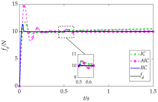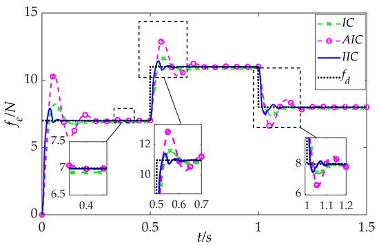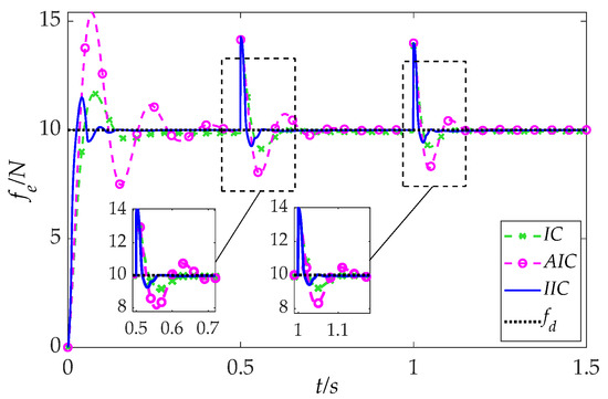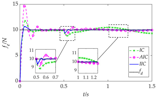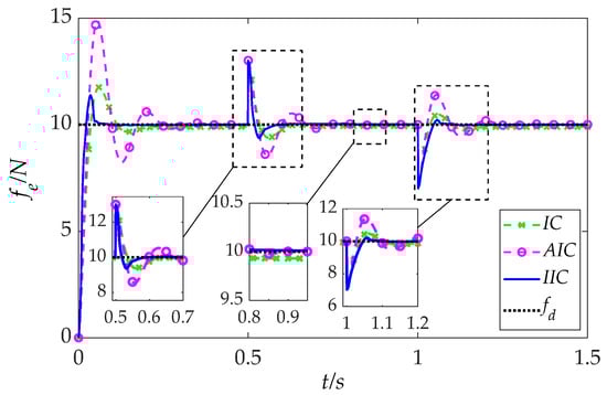 Figure 15. The corresponding force tracking responses using the IC, AIC, and IIC methods are presented in