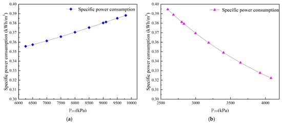 Effect of feed gas pressure on process performance. (a) Flow of the refrigerant; (b) flow rate of stream 203; (c) equipment power consumption; (d) specific power consumption.