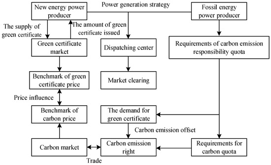 Under the GC-CT mechanism, the strategies adopted by various power generators in the electricity market become more intricate. For high-carbon-emission units, solely relying on increasing power generation and bidding prices to gain more profits may lead to substantial CE costs and GC trading costs. For low-carbon-emission units, the key lies in how to reasonably allocate resources in the GC-CT market to further enhance competitiveness. For NE power generators, participating in both the electricity market and the GC trading market not only directly raises their revenue ceiling but also indirectly increases their cleared electricity volume in the electricity market. Additionally, due to the presence of “carbon” as a common factor, the prices in the GC market and the CT market influence each other. It can thus be seen that the GC market, the CT market, and the electricity market are mutually coupled, with their coupling relationship illustrated in Figure 1.