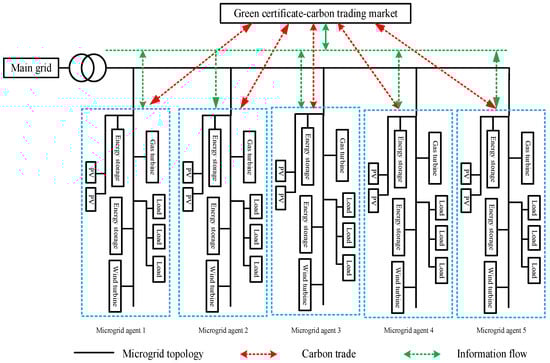 Microgrids utilize NE sources for power generation, and they can also purchase gas from natural gas companies to supply electricity and heat through gas-fired equipment. During peak electricity demand periods, they buy electricity to meet load requirements. Since the actual CEs from purchasing electricity from the main grid (MG) are relatively high, while CT between microgrids is not counted towards the total actual CE, collaboration among multiple microgrids can further unlock their low-carbon potential. When microgrids operate cooperatively, they can engage in negotiated electricity trading with each other. Microgrids with surplus electricity can sell their excess power to other microgrids. Internal electricity transactions between microgrids are transmitted via power interconnection lines, and corresponding grid passage fees are paid to the MG based on the transaction volume. The GC-CT mechanism and multi-microgrid integrated architecture model is shown in Figure 2.