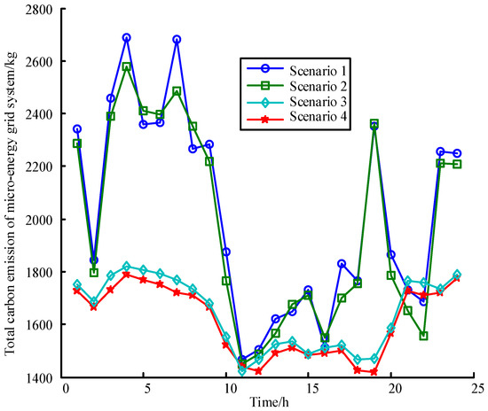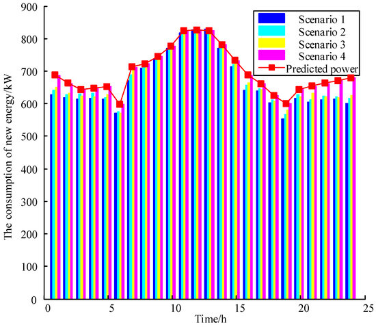 Figure 5 and Figure 6 show the total CE of the micro-energy grid system and the consumption of new energy under various scenarios. As illustrated in Figure 5, when neither scenario 1 nor scenario 2 considers the GC-CT mechanism, the overall CEs of the system are significantly high. However, after incorporating the GC-CT mechanism into scenario 3 and scenario 4 by including CT costs in the OF, the CE of the system are notably reduced. Additionally, compared to scenario 1 and scenario 3, the overall CE of scenario 2 and scenario 4 are lower after the joint operation of the multi-microgrid system. Notably, scenario 4, which employs the method proposed in this paper, achieves the lowest overall CE, further demonstrating the superiority of the proposed method.