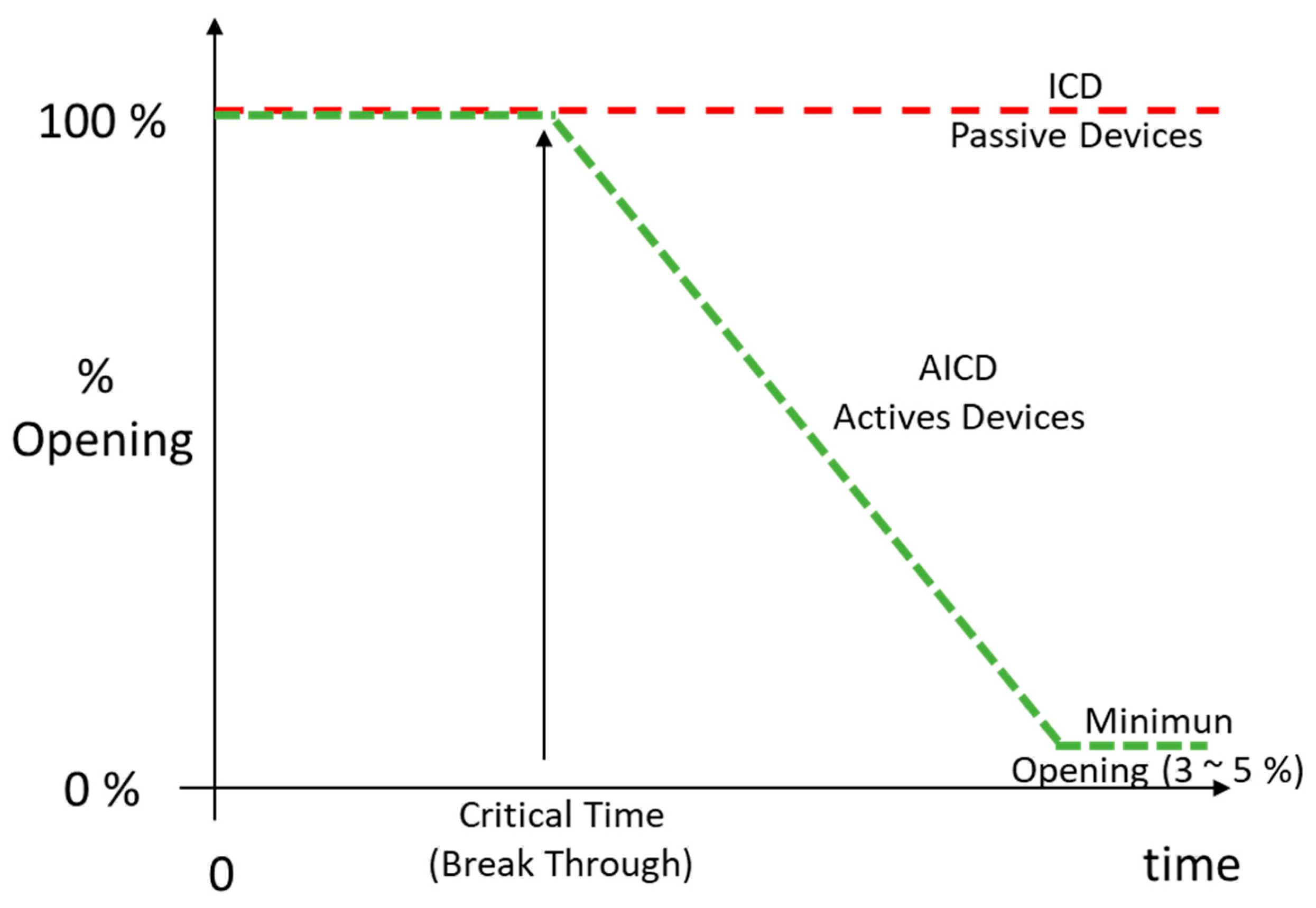 Figure 4 demonstrates how the AICD plugging element position changes over the well’s operational lifetime compared to the fixed position of an ICD device. In the case of the ICD, it will behave as a fixed choke because it does not have a control element. As shown, after the breakthrough, RCP devices will start to close; meanwhile, ICD devices will always have the same area exposed to the reservoir.