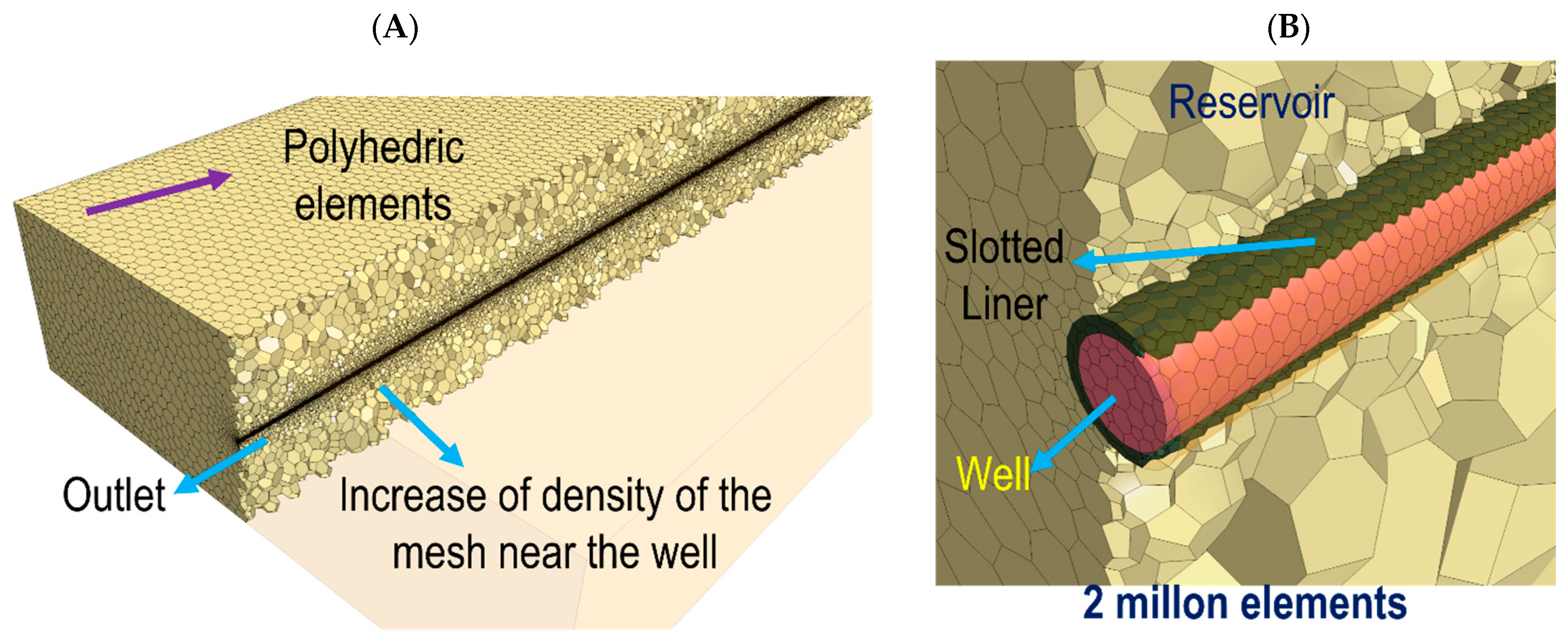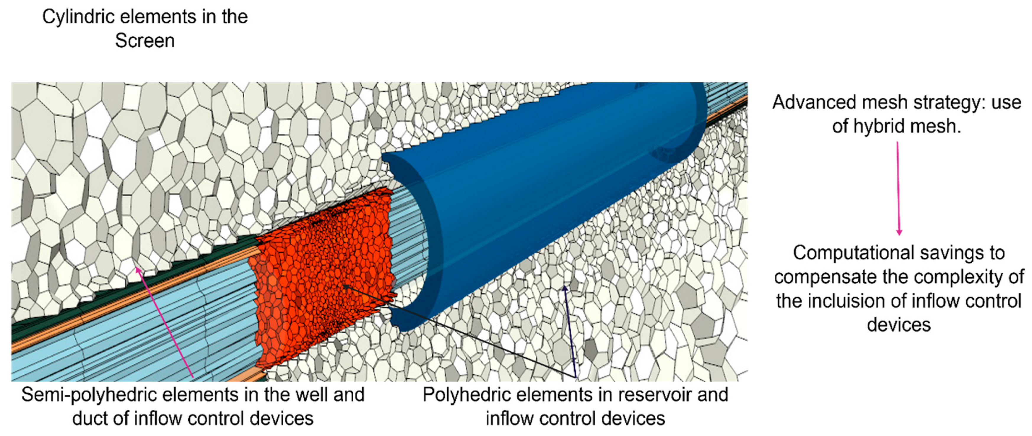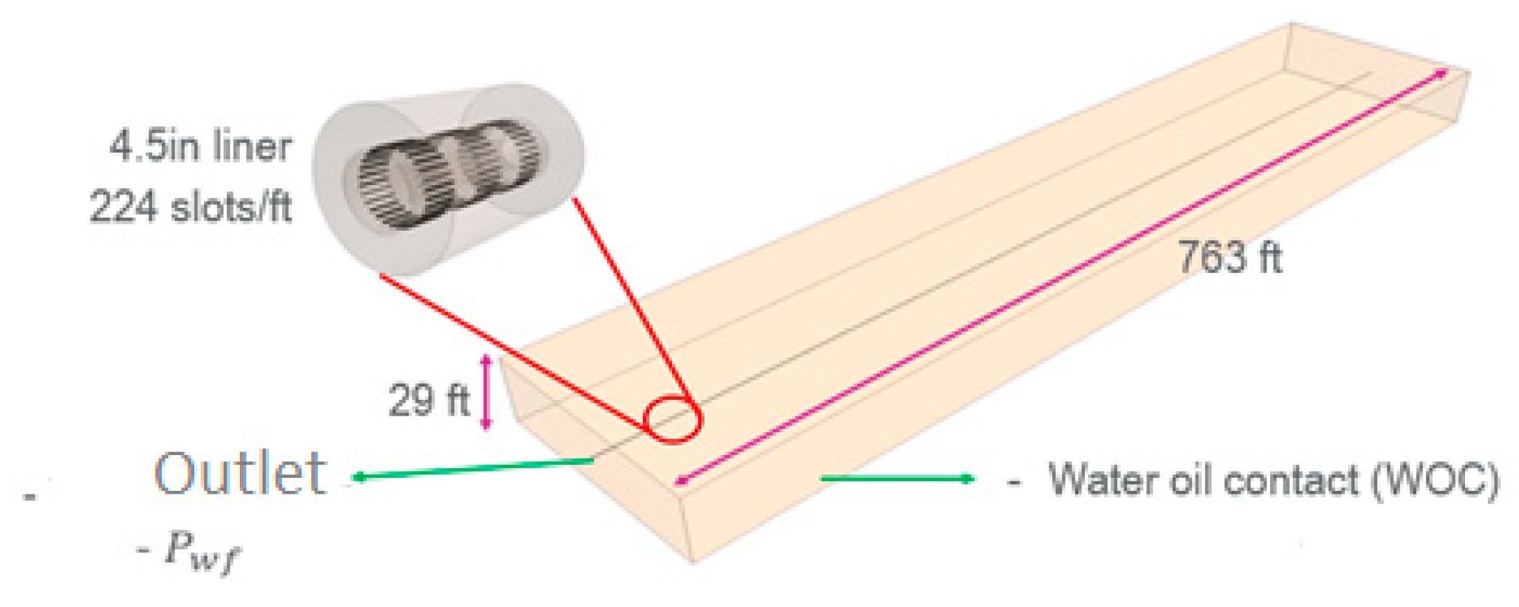 27]. Seeking to understand the performance of downhole water control devices and select the most suitable one for implementation in Field #3, full Navier–Stokes, 3D, transient simulations were performed. Consequently, the numerical model was built to simulate a heavy oil production well and visualize the fluid’s motion from the reservoir into the well, including the bottom aquifer’s unstable displacement and breakthrough event near the wellbore [