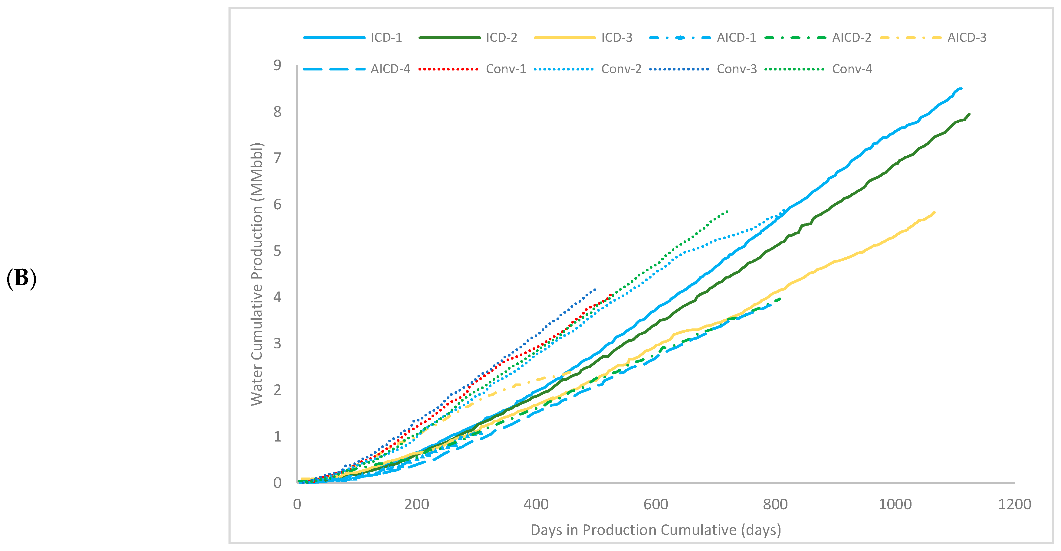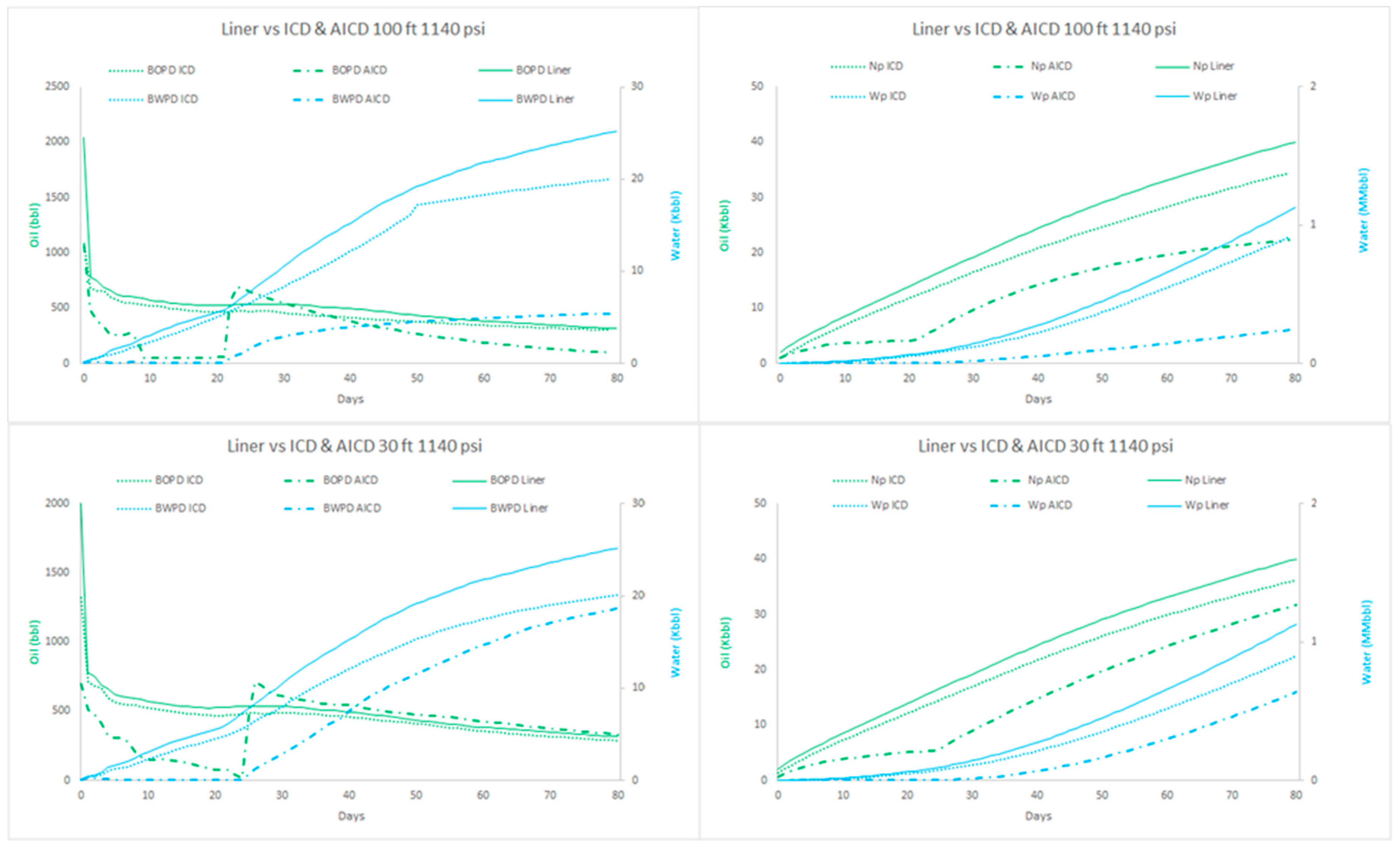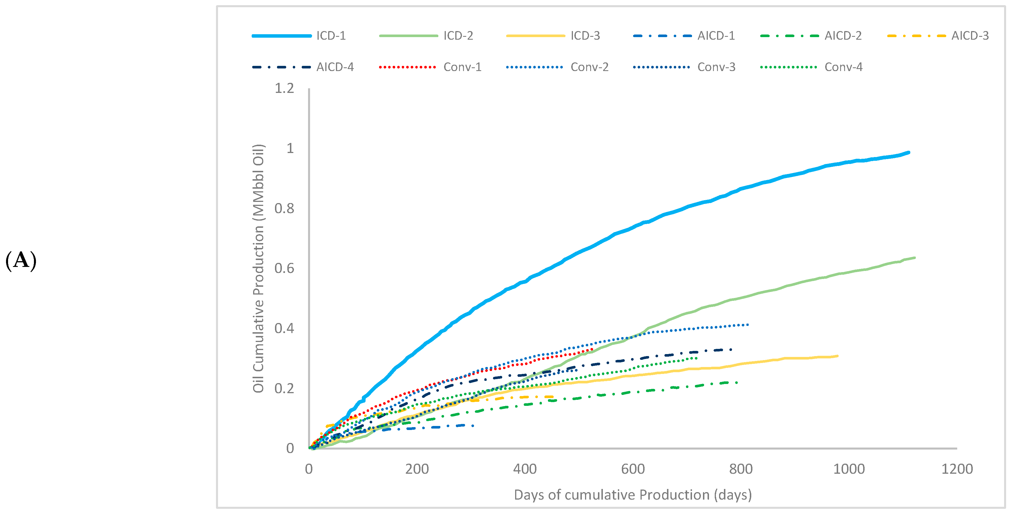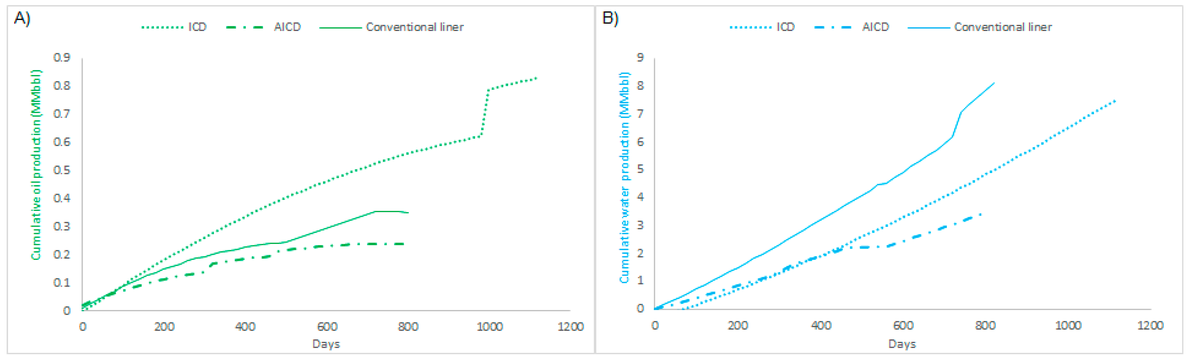 First, completions with ICDs have the most significant amount of cumulative oil and water in the set of wells. The reason behind production is the longevity of the well. With ICDs, the life cycle is around 1100 days, representing 66% more of the lifetime of the wells. Meanwhile, wells with conventional completion last around 800 days, and completions with AICDs last almost 700 days. The cessation of well production is due to economic considerations and limitations in disposal capacity, not always due to the limitation of the capacity of the equipment, but rather due to limits imposed by environmental licenses given by regulatory entities.