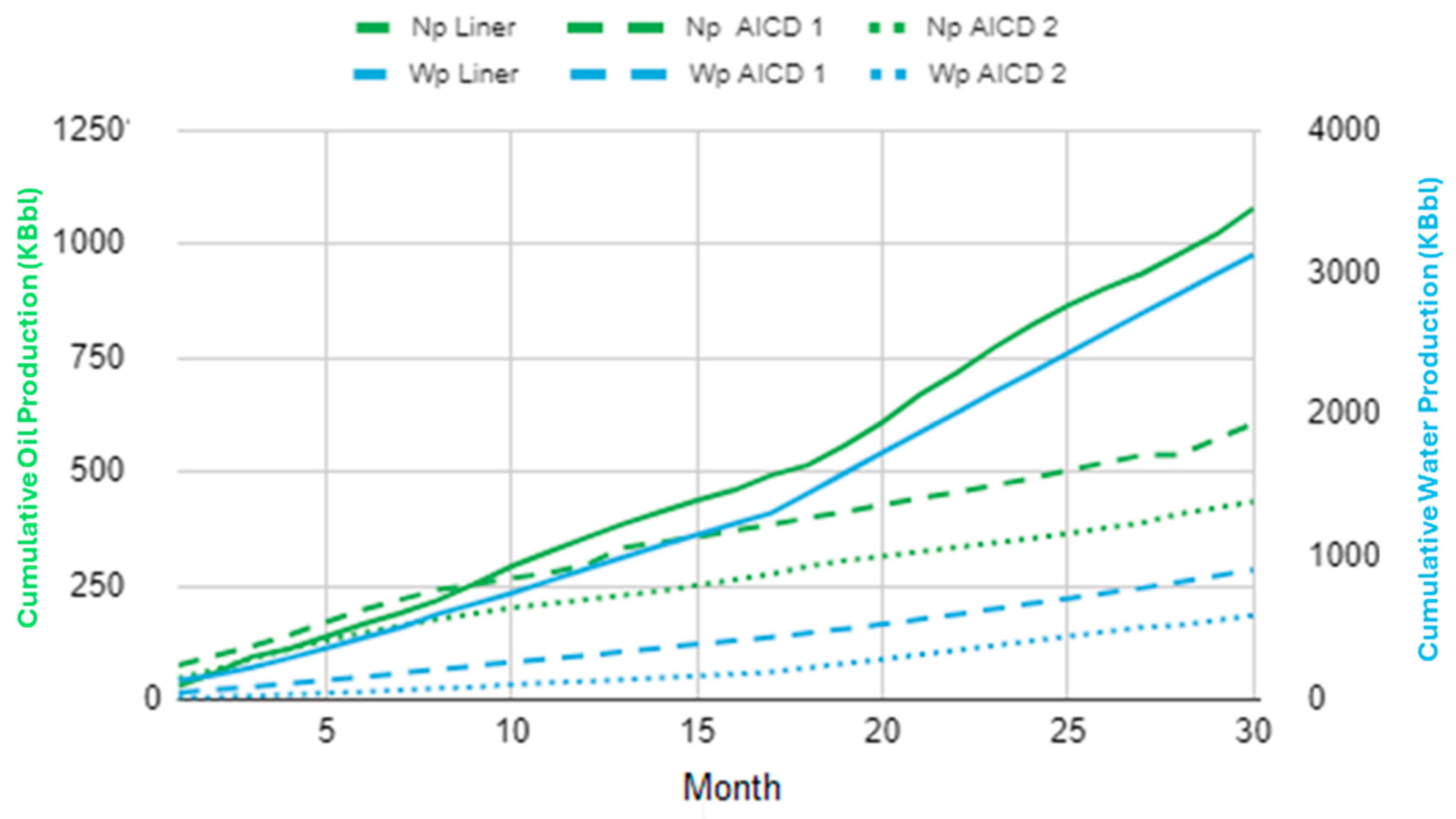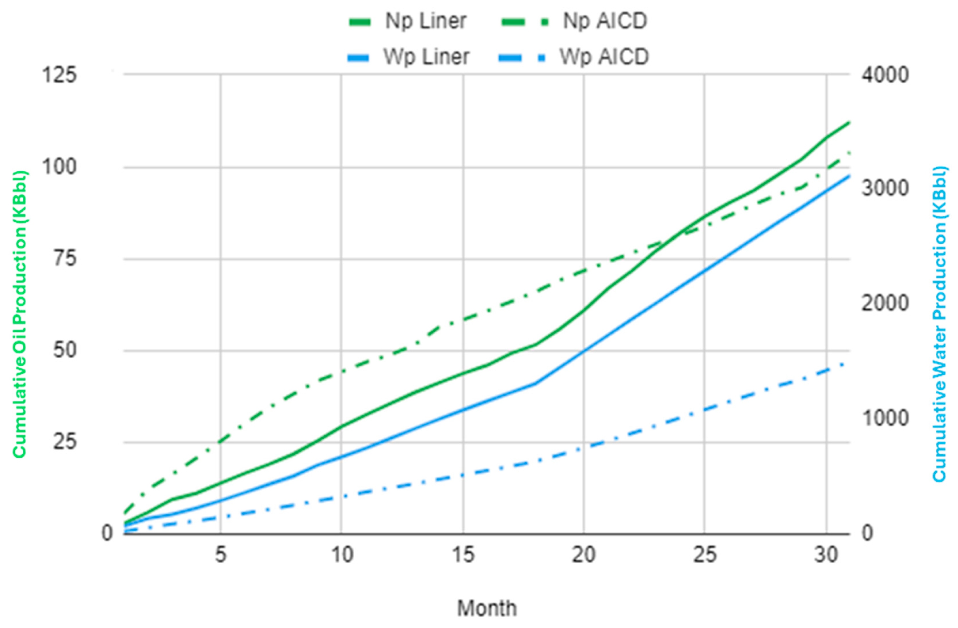 During the first ten months of operation, the three wells experienced similar behavior regarding oil production. Although the oil production from the AICD wells is almost equal to that of conventional wells, its growth slope was less favorable. This resulted in more than 35% additional cumulative oil for the conventional well in the following months. Nevertheless, with this increase in oil, one should not lose sight of the fact that water production has increased, reporting a linear rise. It should be kept in mind that excess water will bottleneck production trunk lines and processing facilities.