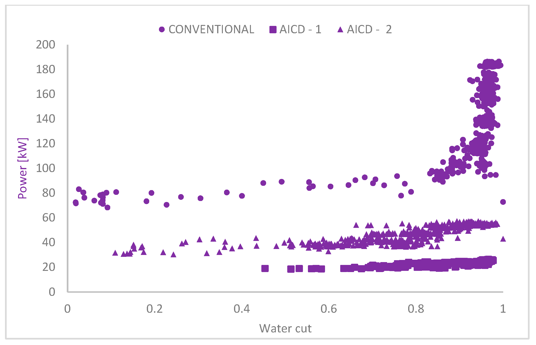 Figure 14 demonstrates electric energy consumption at different water cut values in conventional and AICD completions.