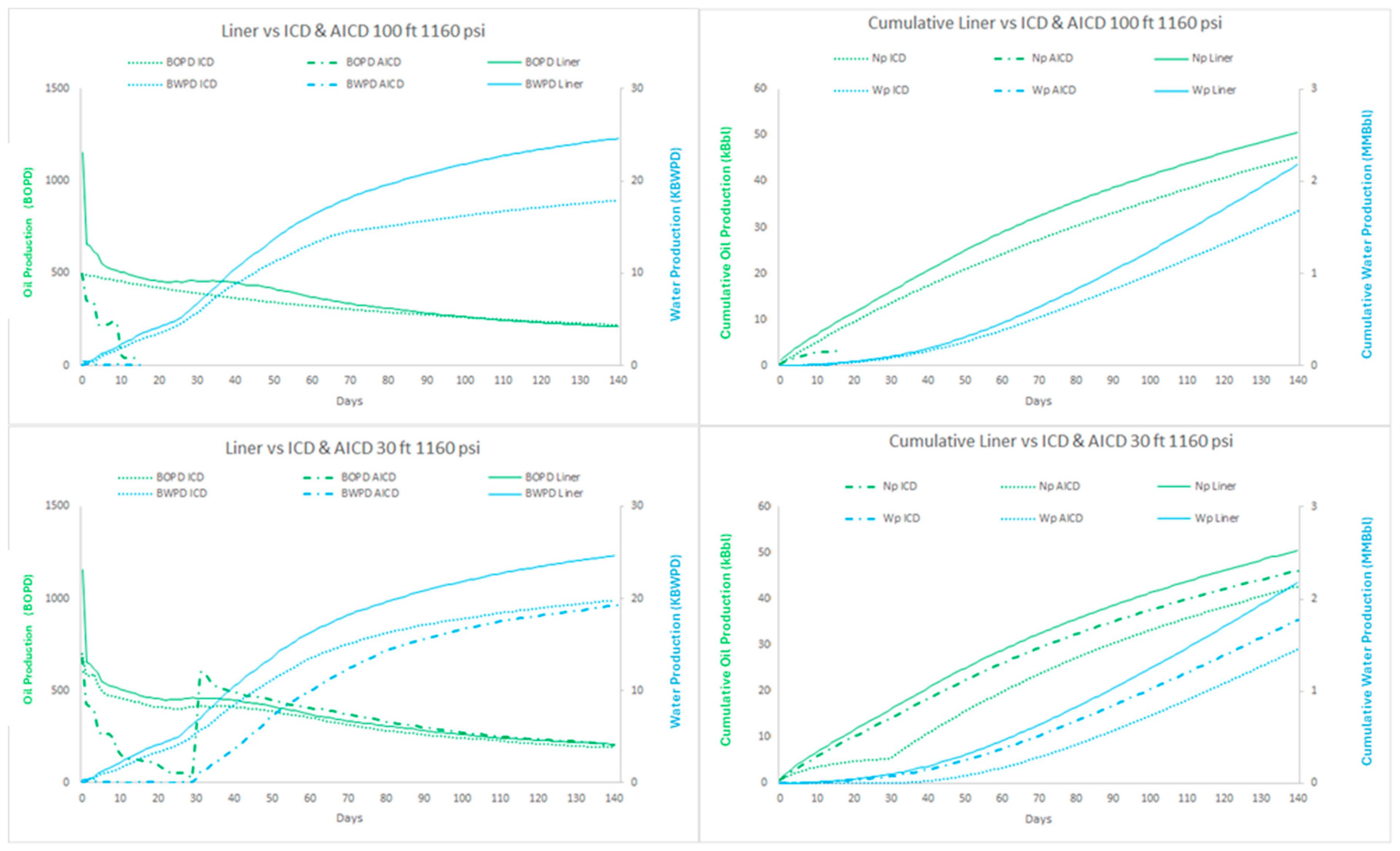 All the tendencies obtained for the first draw-down simulations remained the same. However, as expected, the fluid production rates were higher with a higher draw-down. In other words, it was observed that the completions with devices at any length and liner with a pressure of 1140 psi produced more oil and water than their equivalent completions at 1160 psi. It becomes clear that draw-down management techniques will help to optimize the water control device’s performance. The amount of oil produced by ICDs at a pressure of 1140 psi had a minimal difference compared to the oil production of the liner at a 1160 psi pressure. It was suggested that a liner completion could reach the results achieved by the inflow control devices at 1140 psi and 1160 psi, which is even better as it considers the less amount of water produced.