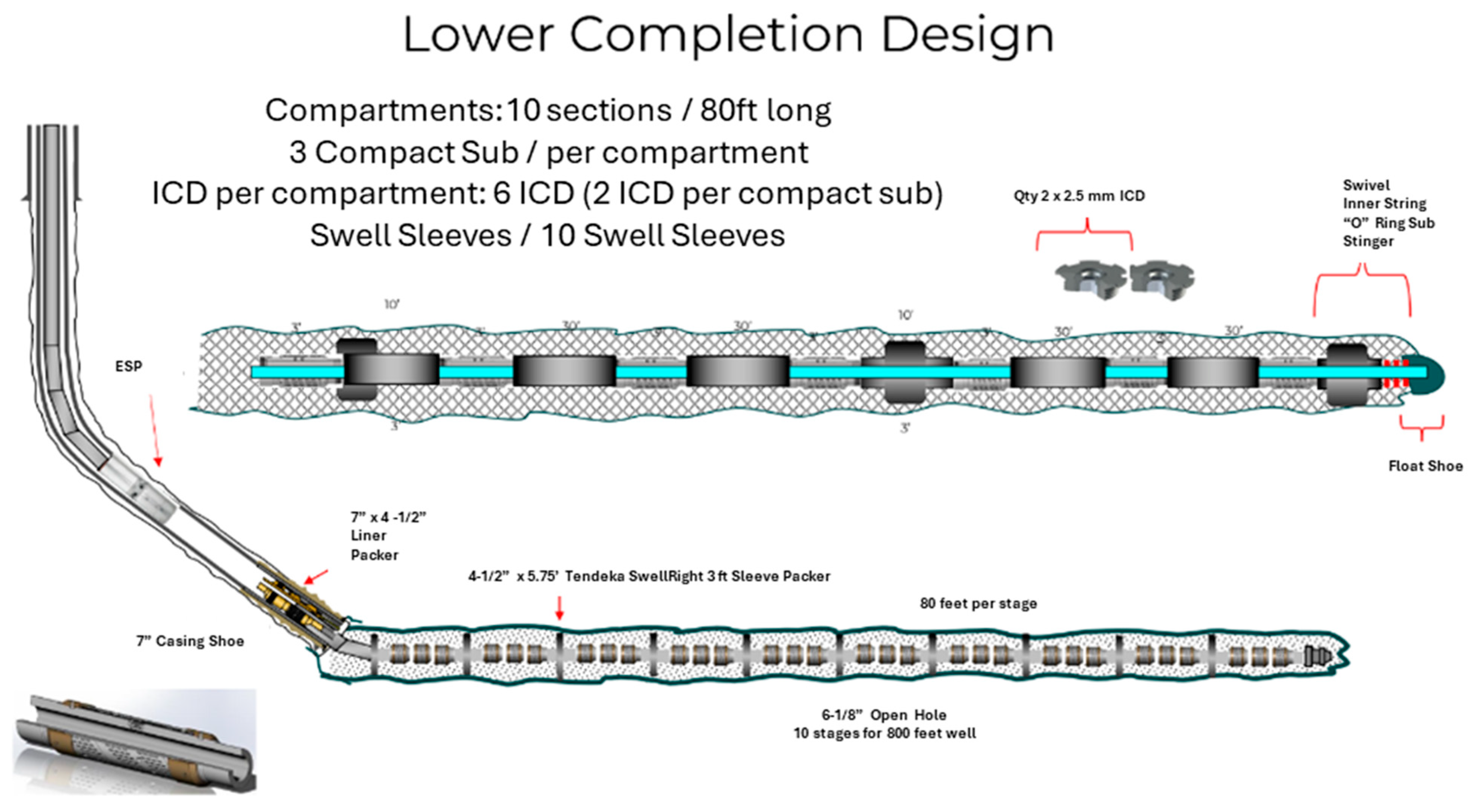 As a second case in 2018, in Field #2, three wells were completed with a new generation of AICDs of the rate-controlled production (RCP) type—two with a horizontal completion of 800 ft and one of 1200 ft in length. The horizontal length was portioned into 100 ft sections with two AICD-RCP devices per section. A schematic of the completion is shown in