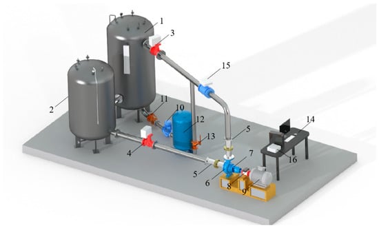 Schematic diagram of the test circuit. 1—Large water tank. 2—Small water tank. 3—Electric valve. 4—Butterfly valve. 5—Pressure measuring tube. 6—PAT. 7—Bearing box. 8—Torque meter. 9—Electric motor. 10—Booster pump. 11—Ball valve I. 12—Pressure regulator tank III. 13—Ball valve II. 14—Host computer. 15—Flowmeter. 16—Acquisition system.