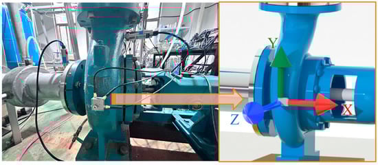The experimental pressure sensors are positioned at the inlet, the tongue of the volute, the second section of the volute, and the outlet of the pump, labeled P1, P2, P3, and P4, respectively, and shown in Figure 3. In this experimental setup, a triaxial vibration acceleration sensor is placed on the volute, positioned as depicted in Figure 4. The pressure sensors used in the experiments were provided by Nanjing Helm Sci-tech Co., Ltd. (Nanjing, China), and the vibration acceleration sensor was supplied by Shanghai Chengtec Electronics Co., Ltd. (Shanghai, China).