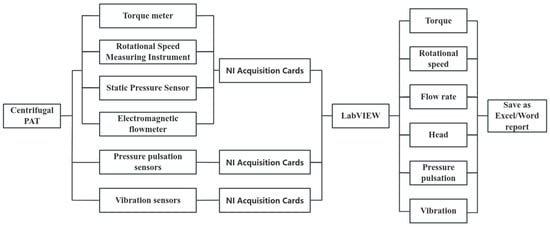 The data acquisition module comprises three components, with the first one collecting the performance parameters of the reversible centrifugal pump, the second one collecting the vibration signals, and the third one collecting pressure the pulsation signals. These signals were simultaneously collected using three NI acquisition cards. The performance acquisition module comprises an inlet, an outlet, a volute, a tongue pressure sensor, an electromagnetic flowmeter, and a torque meter, whose specific parameters are provided in Table 2, and the vibration signals are collected using a three-axis vibration acceleration sensor. The signal acquisition procedures are implemented using LabVIEW, as illustrated in Figure 5.
