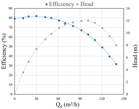The external characteristic curve of the centrifugal pump was obtained with performance tests, and the experimentally obtained head and efficiency are shown in Figure 6.