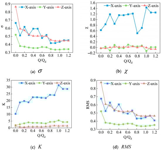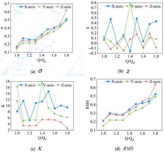 Figure 8 presents the time-domain statistical indicators at different flow rates and 1450 rpm. The results demonstrate that the skewness and kurtosis features exhibit significant variations with the increase in the flow rate, showing chaotic patterns and severe overlap, making it difficult to determine the operating conditions based on these two time-domain characteristics. However, both the standard deviation and RMS values in the Z direction gradually decrease with the increase in the flow rate. Since RMS values can reflect the total energy level of a signal, they can serve as a reliable basis for vibration classification [30].