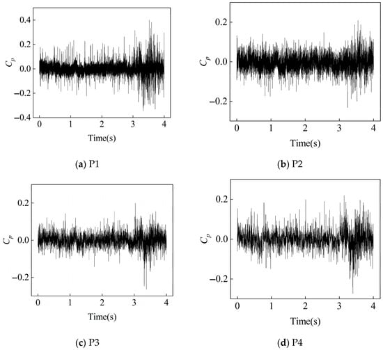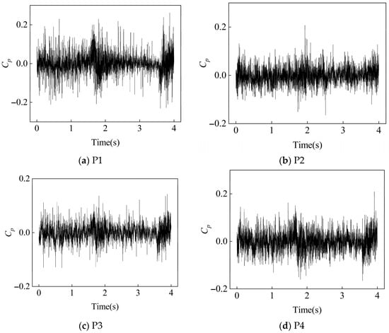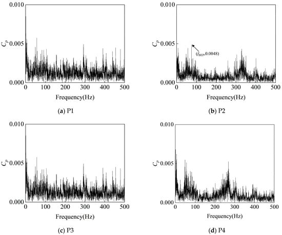 In order to determine the magnitude of the pressure pulsations, we introduce a dimensionless pressure coefficient, , which is a dimensionless number widely used in fluid mechanics to describe the relationship between the pressure at a point on the surface of an object and the dynamic pressure of a free stream. In actual fluid flow, especially under turbulent or other unsteady flow conditions, the pressure is not constant but fluctuates with time, a phenomenon known as pressure pulsation. To describe these pulsation characteristics, we usually adopt statistical measures such as mean and variance (or standard deviation). For pressure pulsations, commonly used statistics include mean pressure, , and pulsation pressure, , where the latter is defined as the difference between the instantaneous pressure and its time-averaged value: