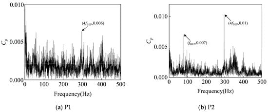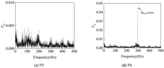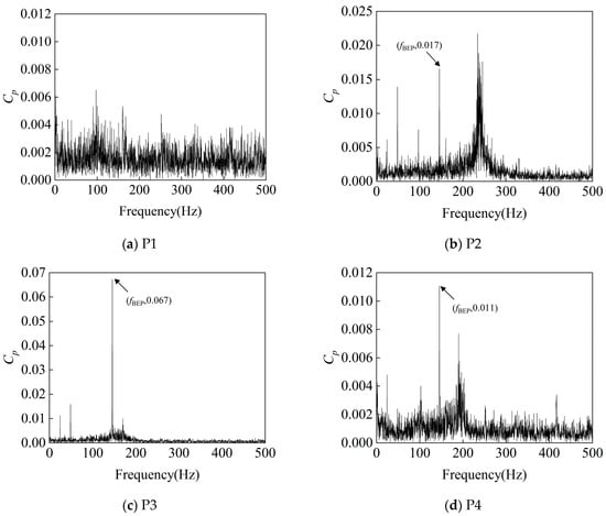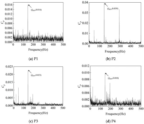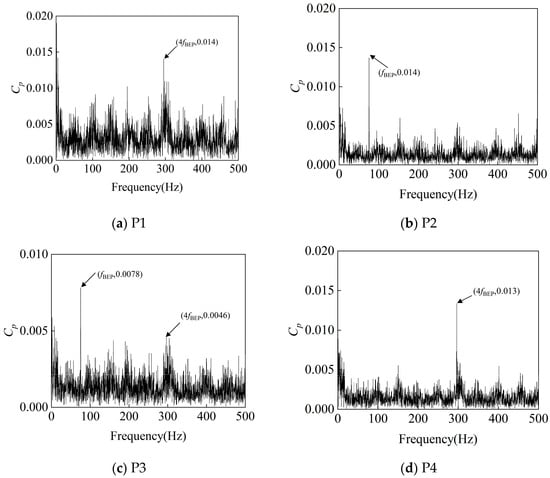 As shown in Figure 22, Figure 23 and Figure 24, in the turbine model at a rotational speed of 750 rpm, the frequency-domain analysis of pressure pulsation signals reveals significant spectral characteristics at monitoring points P1–P4: significant pressure pulsation energy is observed at fn, fBEP, and the latter’s harmonics. This shows that the rotor–stator interaction between the impeller and the volute is an important cause of pressure pulsation.