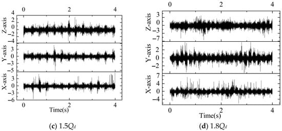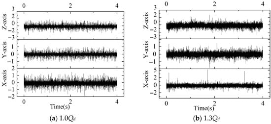 Figure 7 shows the vibration signals at the monitoring point measured with the triaxial vibration sensor under small-flow, rated-flow, and large-flow conditions at the rated speed (1450 rpm). In pump mode, 40,000 vibration data were collected in 4 s at a sampling frequency of fs = 40,000/t = 10,000 Hz.