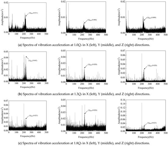 Figure 18 displays the frequency-domain characteristics of vibration signals in the X, Y, and Z directions under different flow conditions. The vibration amplitude shows an increasing trend with the gradual increase in the flow rate, and significant vibration signals are particularly observed at fn, fBEP, and the latter’s harmonics. It is noteworthy that vibrations near 3fBEP are especially prominent. In turbine mode, fluid enters the pump impeller and creates complex flow patterns, and particularly at high flow rates or deviations from design conditions, the fluid may form complex vortex and turbulent structures, which can lead to localized pressure pulsations and significant vibration signals at certain frequencies (e.g., 3fBEP).