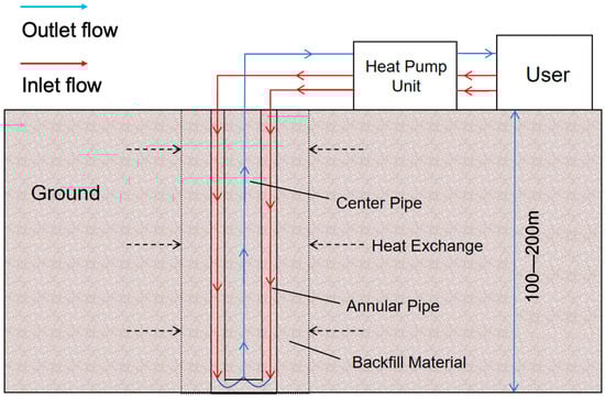 Currently, the most common vertical ground heat exchangers include single U-tube, double U-tube, and coaxial borehole heat exchangers. Compared to U-type borehole heat exchangers (BHEs), CBHEs (coaxial borehole heat exchangers) offer superior heat transfer performance, reduced land use requirements, and enhanced adaptability to site constraints and are therefore selected as the focus of this study. As illustrated in Figure 1, the operational process of shallow GSHP systems initiates with heat exchange between ground heat exchangers and soil. CBHEs transfer thermal energy to the surrounding soil through circulating water. During winter, low-temperature circulating water absorbs thermal energy stored in the soil and is then driven by circulation pumps to the evaporator of the heat pump unit, where a phase change in the refrigerant upgrades the low-grade thermal energy to high-grade thermal energy. Subsequently, it is pressurized and heated by the compressor and then releases thermal energy to the building heating system via the condenser. In summer, the heat pump unit operates in reverse cycle. Circulating water absorbs excess indoor heat via the condenser, exchanges heat with the ground through the CBHEs, and ultimately discharges the thermal energy into the surrounding soil. The essence of the ground heat exchanger lies in two aspects. One is the utilization of existing thermal energy buried underground. Another is seasonal heat storage. The cooling energy extracted in summer from underground can be seen as the energy stored in the previous winter. The heating energy extracted in winter from underground can be seen as the heat energy stored in the previous summer.