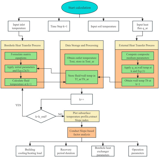 This section presents simulations conducted by developing computational codes that model the heat transfer phenomena occurring both within and around the borehole. Regarding the heat transfer within the borehole, the fluid temperature at time step k + 1 can be calculated using the inlet temperature at time k, along with the wall temperatures of each pipe segment and the fluid temperature in the current step. For the heat transfer process outside the borehole, based on the wall temperatures of each pipe segment and the heat flux density at time k, the wall temperature at time k + 1 can be determined. After coupling the two processes, the above process is repeated until the simulation duration is reached. The calculation flowchart is shown in Figure 2.