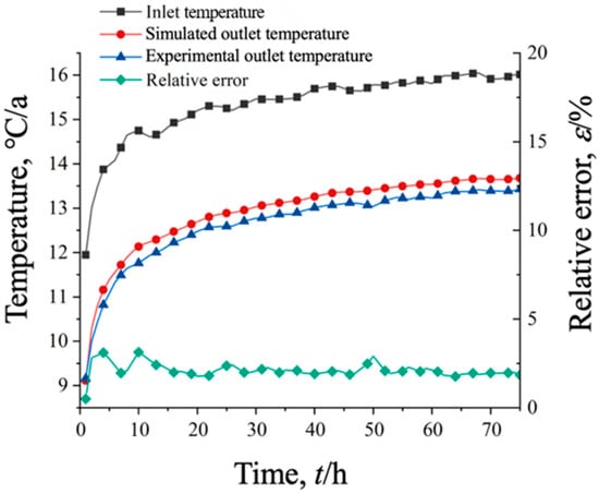 This section validates the proposed mathematical model through a comparative analysis between simulation outcomes and experimental data reported in previous studies. The experimental data are sourced from Beier RA et al. [26]. Table 1 specifies the fundamental parameters, including a geothermal gradient of 0.03 °C/m and a simulation duration of 75 h. The sizing and thermal parameters in Table 1 are common values for CBHE. It should be specially noted that the model parameters of steps Δz and Δτ can be adjusted according to demand. A smaller space step will produce a finer simulation result, but it will also require a longer computation time. A comparison between the simulation outputs and experimental measurements is presented in Figure 3. The results indicate that the maximum error between the simulated outlet water temperature and the experimental outlet water temperature is 3.61%. The numerically simulated outlet temperature of the ground-coupled heat exchanger shows strong agreement with the observed monitoring data, confirming the model’s high reliability. It is observed that the simulation results are slightly higher than the experimental data. This is probably caused by inaccurate parameters in Table 1 or the experimental error itself.