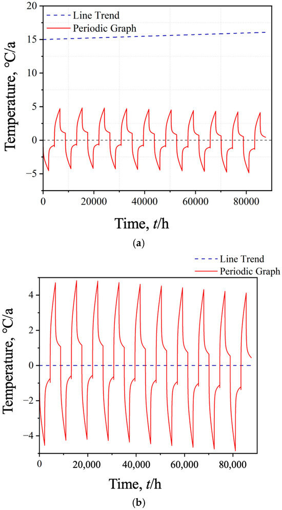 During long-term operation of GSHP systems, building cooling/heating load imbalances induce progressive directional changes in soil temperatures. This manifests as sustained thermal accumulation phenomena underground, characterized by either monotonic warming or cooling trends. Based on the heat transfer analytical solution model established, a ten-year simulation of the system is conducted to study the temperature variation over time at a depth of 85 m from the center pipe wall. The results showed that the soil temperature variation over time was composed of a linear trend line and a periodic curve. The curve could be split, as shown in Figure 4a. We adopt the linear trend Slope as the evaluation metric. To verify its accuracy, secondary decomposition of the periodic curve is performed, as shown in Figure 4b. After secondary decomposition, the Slope of the linear trend approaches 0, indicating that the Slope metric meets the accuracy requirements. Considering the linear trend is negligible in the second-round decomposition, there is no need for another decomposition. The temperature curve is obtained under a constant cooling or heating load profile, but the linear trend extraction method will not be influenced if a real-world load profile is imposed. This method works equally well for both cooling and heating situations.