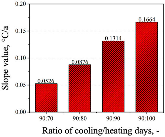 Under constant heating season duration, as the cooling time increases, the degree of soil heat accumulation gradually deepens. For every ten days of additional operating time during the cooling season, the Slope (°C/a) metric increases by 0.038, meaning the soil temperature rises by 0.038 °C annually. When the number of heating and cooling days decreases proportionally, the recovery period lengthens within the operating cycle, and the Slope (°C/a) metric gradually decreases, alleviating soil heat accumulation.