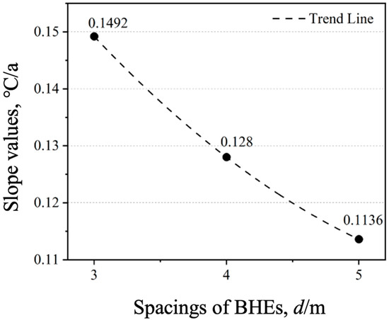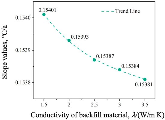 To examine the influence of backfill thermal conductivity on heat accumulation in the surrounding soil, the parameter is systematically varied at values of 1.5, 2.0, 2.5, 3.0, and 3.5 W/(m·K). The results are shown in Figure 10. While increased conductivity reduces the Slope(°C/a) metric, indicating mitigated heat accumulation, the improvement magnitude remains limited. The effect is attributed to improved heat conduction between the pipe and soil at higher backfill conductivities. Nonetheless, if the conductivity of the backfill greatly exceeds that of the soil, the benefit may diminish due to mismatched thermal properties. Heat becomes concentrated near the pipes rather than dissipating radially, thus diminishing the Slope reduction effect.