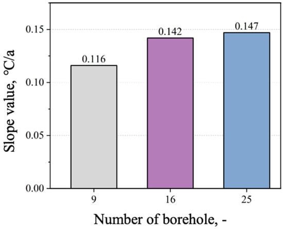 The sign and magnitude of the Slope metric (°C/a) determine both the polarity and severity of subsurface thermal accumulation. A positive Slope signifies heat accumulation, where soil temperature increases progressively over time, with higher values indicating greater severity. A negative Slope denotes cold accumulation, characterized by a progressive temperature decrease, where more negative values reflect increased severity. While Slope (°C/h) serves as a subsurface thermal accumulation metric, its small value makes it difficult to intuitively determine the extent of thermal accumulation. Therefore, this study adopts Slope (°C/a) as the standardized indicator for quantifying thermal accumulation.