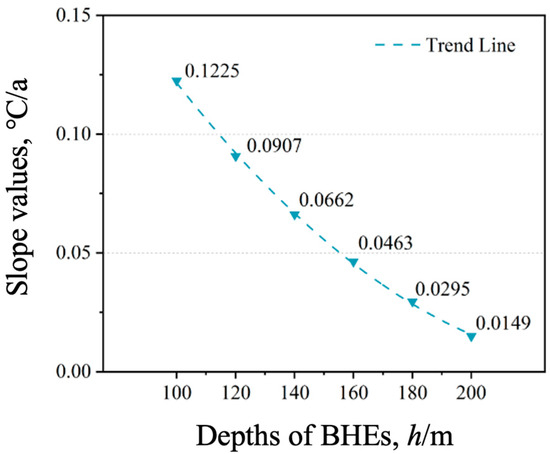 Figure 9 illustrates the impact of vertical borehole depth on subsurface thermal accumulation. As borehole depth increases, the thermal load per unit depth decreases, resulting in an exponential reduction in the Slope (°C/a) metric. This demonstrates that greater vertical borehole depths effectively mitigate soil thermal accumulation. When depth extends from 100 m to 200 m, Slope decreases from 0.1225 to 0.0149 °C/a, corresponding to a 0.1076 °C reduction in the average annual soil temperature rise.