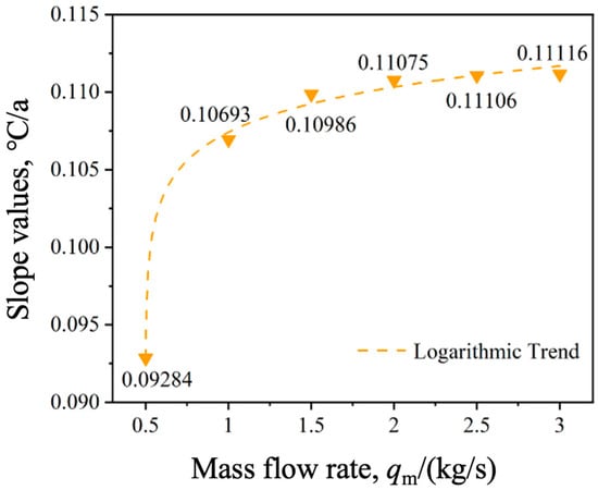 The flow rate of circulating water is adjusted incrementally to 0.5, 1.0, 1.5, 2.0, 2.5, and 3.0 m3/h, and the corresponding results are illustrated in Figure 11. Increasing the flow rate enhances the convection coefficient between the fluid and the pipe walls, leading to an increase in the heat transfer rate per unit time. Consequently, more thermal energy is conducted to the surrounding soil per unit time, deepening soil thermal accumulation. However, equal flow increments produce diminishing temperature rises, and soil warming progressively attenuates at higher flow rates.