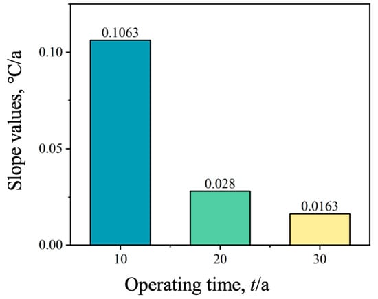 To study the impact of system operating years on soil heat accumulation, we simulate the system’s operation for 10, 20, and 30 years. The results are shown in Figure 13. Analysis of the corresponding Slope (°C/a) metrics reveals that extended operation significantly mitigates thermal accumulation under balanced annual cooling/heating loads. Prolonged operation facilitates thermal diffusion, promoting homogeneous heat distribution across broader geological volumes and reducing localized accumulation rates.