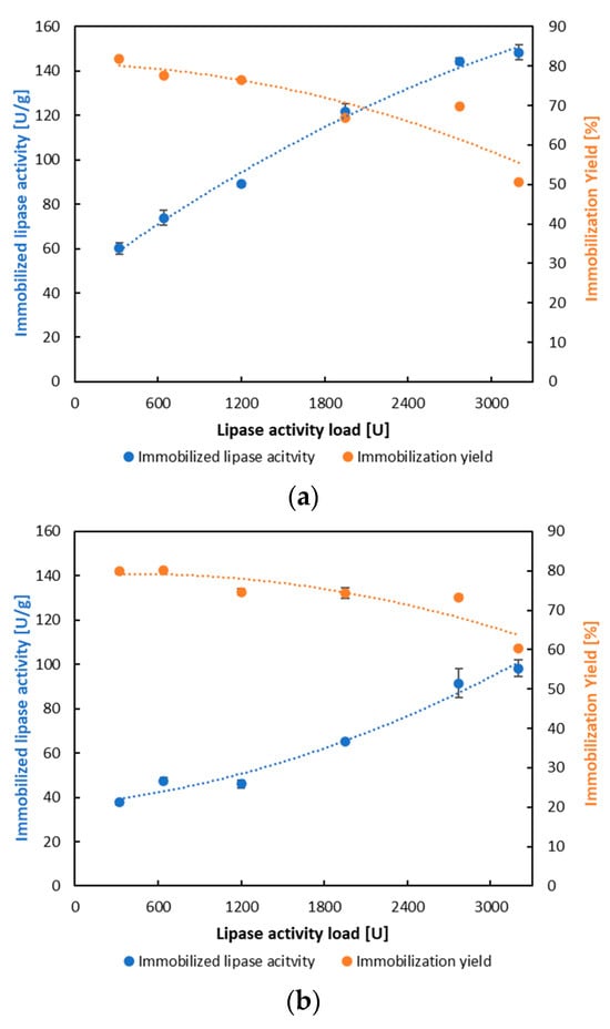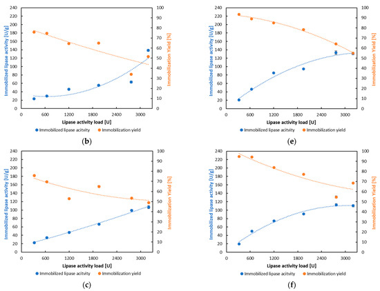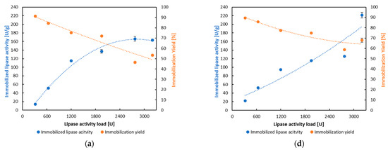 Effect of lipase activity load on the activity of immobilized lipase and immobilization yield by direct covalent binding (a–c) and indirect covalent binding (d–f): (a,d) ESMC-HCl, (b,e) ESMC-HAc, (c,f) ESMC-H3PO4.