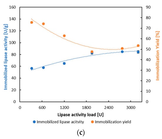Effect of lipase activity load on the activity of immobilized lipase and immobilization yield by adsorption: (a) ESMC-HCl, (b) ESMC-HAc, (c) ESMC-H3PO4.