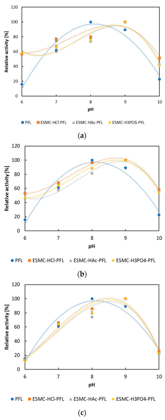 This article investigates the immobilization of PFL on ESMC treated with different acids using a range of initial enzyme activities from 320 to 3200 U. Early investigations identified that one hour is the most suitable time for effective immobilization, either by adsorption or covalent binding (Figures S1 and S2). Beyond this period, a decrease in enzymatic activity was observed, probably due to the formation of multilayers on the carrier surface, which cause steric hindrances between enzyme molecules and negatively affect their catalytic function by restricting substrate access. As shown in Figure 1, an increase in the initial lipase concentration leads to enhanced catalytic activity of the immobilized enzyme. However, this is accompanied by a decrease in immobilization yield, which ranged from 81.74% at the lowest concentrations to 50.57% at the highest concentrations. The decrease in immobilization yield at higher enzyme concentrations is due to the saturation of available binding sites on the carrier surface. When the enzyme concentration exceeds the carrier’s binding capacity, excess enzyme remains unbound in solution, leading to a lower calculated immobilization yield. Despite this, the total amount of immobilized enzyme and corresponding catalytic activity can still increase up to an optimal point before steric hindrance or multilayer formation negatively affects performance. The increased activity can be attributed to the greater availability of enzyme molecules for interaction with the carrier material. When different acid-modified ESMC carriers were evaluated, ESMC-HCl exhibited the highest activity at 3200 U, reaching 148.38 ± 3.48 U/g. A similar trend was observed for ESMC-HAc, where the maximum activity was also reached at 3200 U, yielding 98.26 ± 3.65 U/g. In contrast, ESMC-H3PO4 showed its highest activity at a slightly lower enzyme load of 2770 U, with a specific activity of 84.94 ± 0.73 U/g. These values are notably higher than those in the study by Jiang et al. [36], in which BCL immobilized on an eggshell membrane showed a maximum ester hydrolysis activity of only 12 U/g. Overall, the results suggest that higher loading of enzymes improves catalytic performance up to a certain point; however, excess enzymes may lead to limitations due to carrier surface saturation and lower binding efficiency. The careful tuning of immobilization time and enzyme concentration is therefore essential to achieve optimal performance of the biocatalyst.