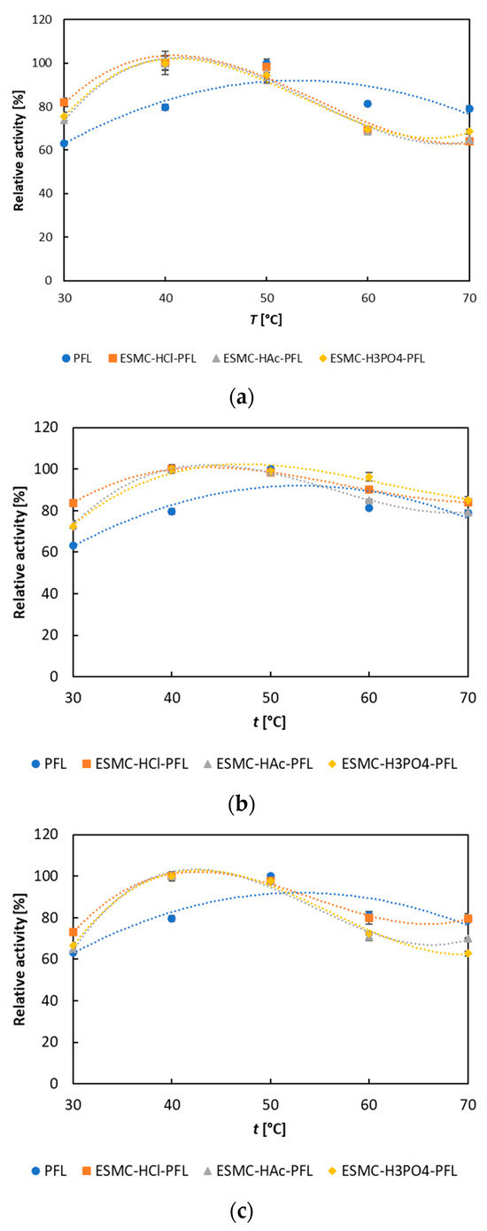 Temperature optimum of free and lipase immobilized by (a) adsorption, (b) direct covalent binding, and (c) indirect covalent binding. Results are shown as averaged relative enzyme activity ± standard deviation of three independent determinations.