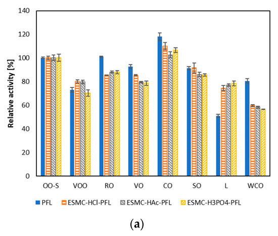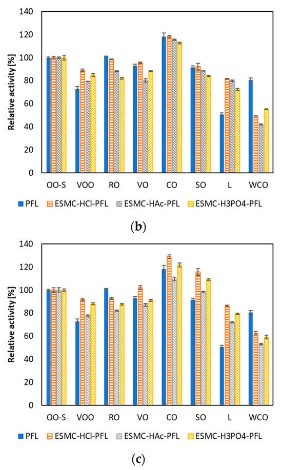Substrate specificity of free and lipase immobilized by (a) adsorption, (b) direct covalent binding, and (c) indirect covalent binding to selected oils and fats (OO-S—olive oil standard, VOO—virgin olive oil, RO—rapeseed oil, VO—vegetable oil, CO—coconut oil, SO—sunflower oil, L—lard, WCO—waste cooking oil). Results are shown as averaged relative enzyme activity ± standard deviation of three independent determinations.