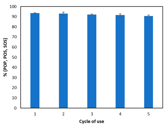 Cocoa butter substitutes are widely used in the food industry due to the high cost and limited availability of natural cocoa butter. Their synthesis typically requires specific triacylglycerols, including POP, POS, and SOS, which impart the desired physical and sensory properties. In this study, the functionality of PFL immobilized on ESMC-HCl was evaluated in the enzymatic synthesis of CBS (Figure 7). The product obtained in the first reaction cycle was thick, viscous, and cream-colored, with a yield of 93.53 ± 0.16% of the desired triacylglycerols (POP, POS, and SOS) (Figure S3). Notably, the immobilized enzyme demonstrated excellent reusability; after five consecutive reaction cycles, the yield remained high at 90.69 ± 0.85%. These results indicate that ESMC-HCl-PFL is highly effective for synthesizing cocoa butter substitutes and retains its catalytic performance over multiple uses. Compared to previous work by Saxena et al. [35], who reported an 83.17% yield using a free Bacillus sp. RK-3 lipase at 37 °C with overnight incubation, our immobilized enzyme system demonstrates significantly improved efficiency. While reaction conditions differ slightly, both systems use the same substrates, allowing for meaningful comparison. The enhanced yield is likely due to improved catalytic stability and substrate accessibility conferred by enzyme immobilization. Furthermore, the immobilized lipase showed excellent reusability, maintaining a high CBS yield of 90.69 ± 0.85% after five consecutive reaction cycles, which highlights its potential for cost-effective industrial applications, offering both economic and practical advantages.
