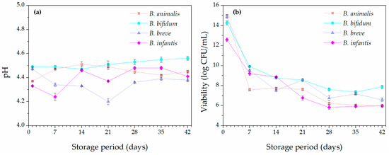 The variation in the pH (a) and viable cell counts (b) during the 42-day refrigerated storage period of potential probiotic beverages fermented with Bifidobacterium spp.