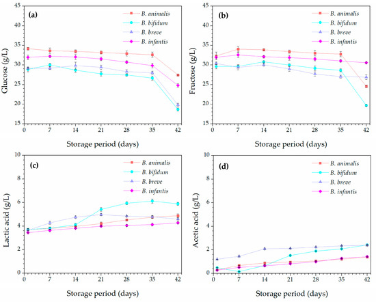 Concentrations of glucose (a), fructose (b), lactic acid (c), and acetic acid (d) during the 42-day refrigerated storage period of potential probiotic beverages fermented with Bifidobacterium spp.