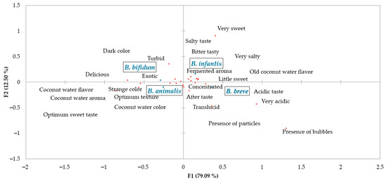 Regarding the aroma, the coconut water fermented by B. breve and B. infantis had the highest frequencies (p < 0.05) for the term “fermented aroma” and the lowest for the term “coconut water aroma”. This greater aroma from fermentation reduced the coconut water aroma characteristics of these beverages, resulting in the lower acceptance of them according to the data from the hedonic scale (Table 3).