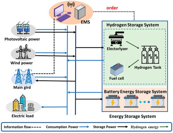Driven by the intensification of the global energy crisis and the escalating impacts of climate change, the demand for RES has surged worldwide. Among these, photovoltaic (PV) and wind power have emerged as critical components of the global energy mix, driving the transition toward sustainable development [1,2,3]. However, the intrinsic intermittency and unpredictability of RES present significant challenges to grid stability, energy consumption efficiency, and system reliability. To address these challenges, MGs have gained increasing attention due to their ability to integrate diverse RES and enable localized energy management. This has spurred the development of advanced EMS [4,5]. In EMS, the integration of efficient energy storage systems (ESS) and the design of adaptive energy dispatch strategies have become key approaches to improving the operational performance and reliability of MGs [2,6].
