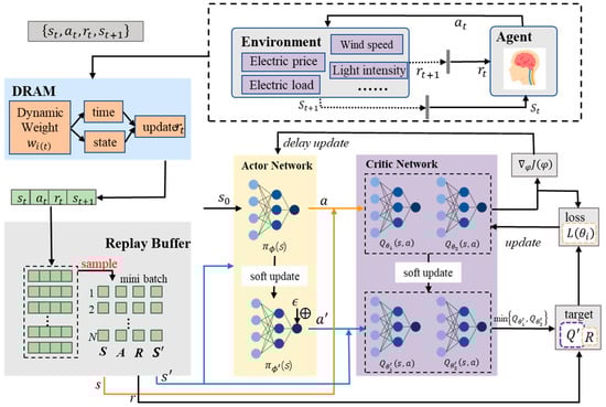 Figure 3 illustrates the architecture of MOATD3, showing how the agent engages with the environment. At each time step, the agent observes the current state of the environment, and based on this observation, it selects an action . The environment then returns the next state and a reward , which is dynamically adjusted by the DRAM. This mechanism allows the reward weights to adapt during training, helping the agent balance multiple objectives. The TD3 algorithm [34,35] adopts an actor–critic framework consisting of one actor network alongside two critic networks, which helps mitigate overvaluation bias in value estimation and stabilizes the training process. By combining the structural strengths of TD3 with the adaptive weighting strategy provided by DRAM, MOATD3 not only enhances learning stability but also effectively captures the balance between short- and long-term objectives, thus enabling more resilient and goal-aware policy learning in multi-objective environments.