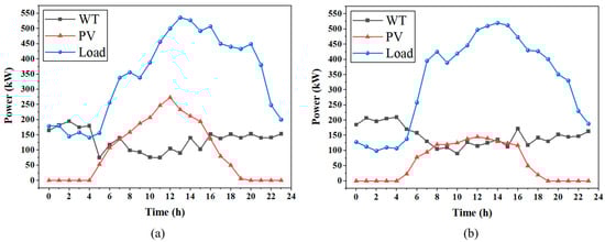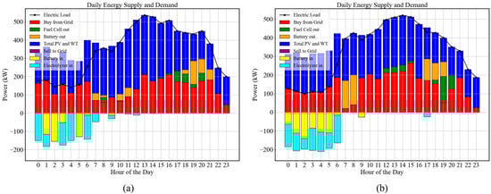 In this section, two different weather conditions are selected as representative scenarios, using 24 h data with a 1-hour time step for energy scheduling. To comprehensively assess the performance of the HHB-ESS and MOATD3 algorithm, comparative experiments are conducted under four different scenarios and strategies. The results demonstrate the proposed method’s advantages in handling dynamic energy demand and ensuring system stability.