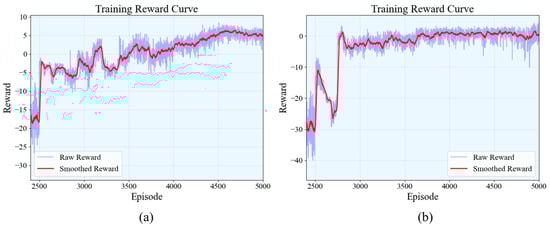 Training reward curve of the MOATD3 algorithm: (a) good weather; (b) bad weather.