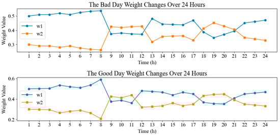 Additionally, Figure 7 further demonstrates the adaptability of the MOATD3 algorithm by showing the dynamic adjustment of the stability reward weight () and economic reward weight () over a 24 h cycle. Overall, the economic reward weight is higher during midday and evening peak electricity consumption periods due to higher electricity prices. Under good weather conditions, the high output and large intra-hour fluctuations of renewable energy make it prone to disrupting the main grid stability. Thus, the stability weight is generally higher. In adverse weather conditions, the system shifts its focus to the economy to maintain lower costs. This dynamic adaptation mechanism embodies the core advantage of the MOATD3 algorithm: intelligently balancing economic optimization and system stability based on real-time environmental changes.