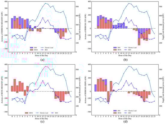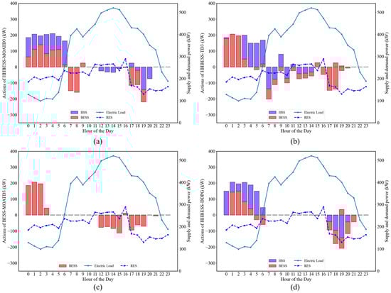 Decision-making under good weather conditions using different methods: (a) HHBESS-MOATD3; (b) HHBESS-TD3; (c) BESS-MOATD3; (d) HHBESS-DDPG.